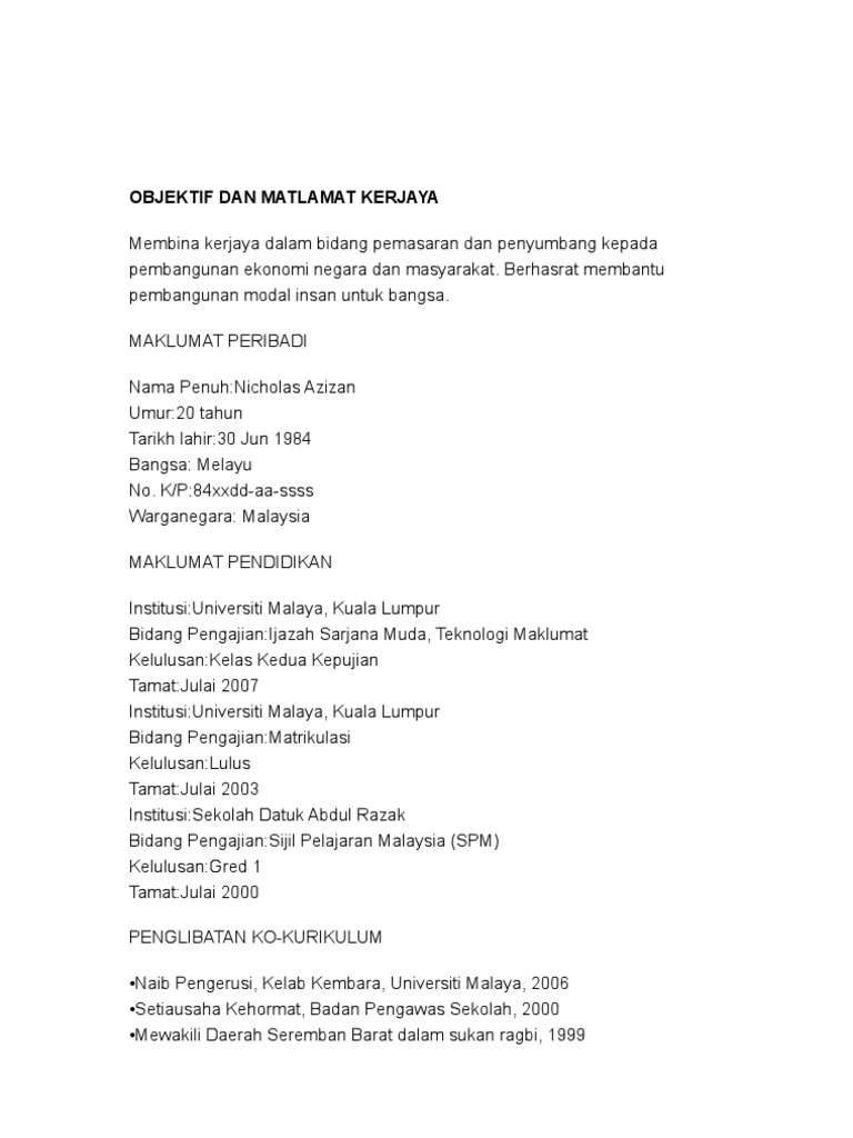 Resume muhamad syahmi bin elias 49 jalan perumahan timur bandar penawar 81930 johor email. Tetapi yang pasti dalam subjektif dan objektif dapat. Wajib ada satu email formal dan no telefon yang tidak akan ditukar-tukar walaupun anda clash.